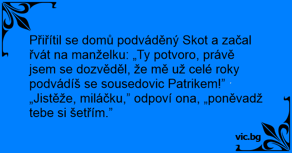 Přiřítil se domů podváděný Skot a začal řvát na manželku: „Ty potvoro, právě jsem se dozvěděl, že mě už celé roky podvádíš se sousedovic Patrikem!”