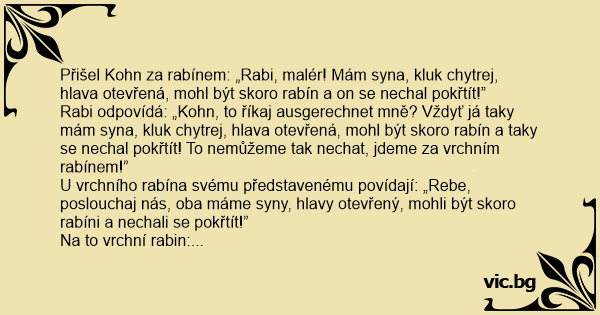 Rabi odpovídá: „Kohn, to říkaj ausgerechnet mně? Vždyť já taky mám syna, kluk chytrej, hlava otevřená, mohl být skoro rabín a taky se nechal pokřtít! To nemůžeme tak nechat, jdeme za vrchním rabínem!”