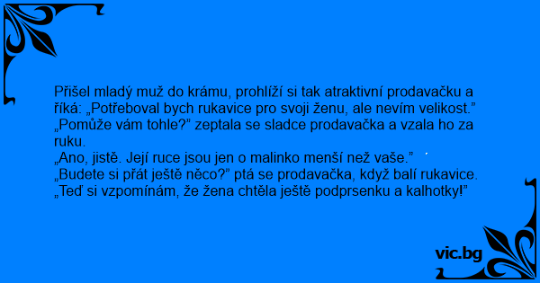 Přišel mladý muž do krámu, prohlíží si tak atraktivní prodavačku a říká: „Potřeboval bych rukavice pro svoji ženu, ale nevím velikost.”