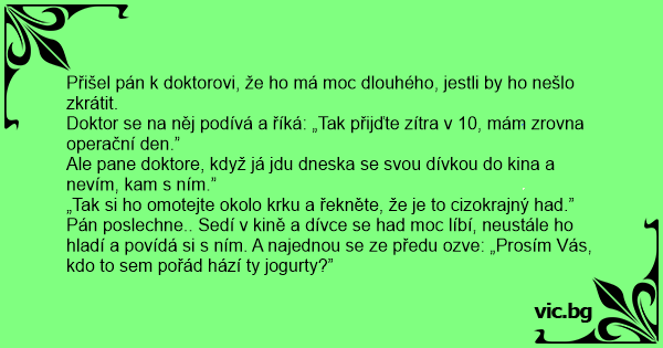 Pán poslechne.. Sedí v kině a dívce se had moc líbí, neustále hо hladí a povídá si s ním. A najednou se ze předu ozve: „Prosím Vás, kdo to sem pořád hází ty jogurty?”
