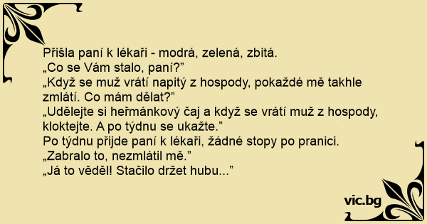 Přišla paní k lékaři - modrá, zelená, zbitá.