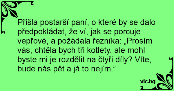 Přišla postarší paní, o které by se dalo předpokládat, že ví, jak se porcuje vepřové, a požádala řezníka: „Prosím vás, chtěla bych tři kotlety, ale mohl byste mi je rozdělit na čtyři díly? Víte, bude nás pět a já to nejím.”