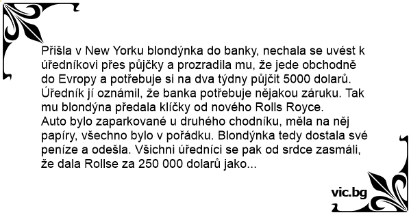 Niujorke į banką užeina blondinė ir sako: - Vykstu dviem savaitėm į Europą verslo reikalais ir noriu iš jūsų paimti 5000 dolerių paskolą. - Tvarkoj, bet mums reikia kokių nors garantijų, kad...