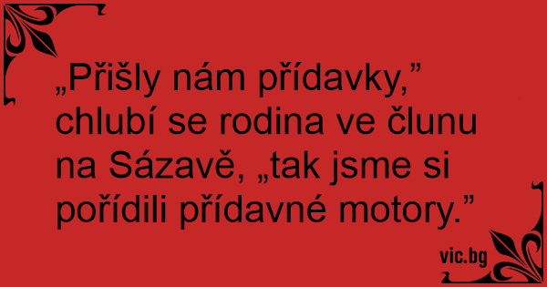 „Přišly nám přídavky,” chlubí se rodina ve člunu na Sázavě, „tak jsme si pořídili přídavné motory.”