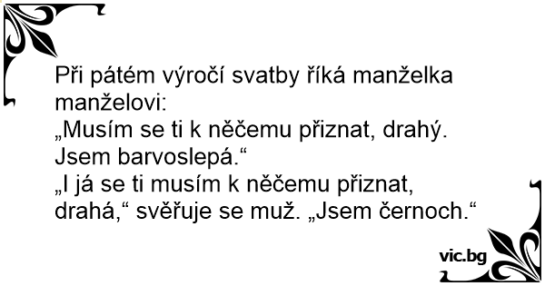 Det var ett par som varit lyckligt gifta i 40 år. En dag säger mannen. - Älskling det är något jag vill bekänna för dig, jag är färgblind. - Jag har något att bekänna för dig också sa frun. Jag är...