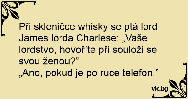 Při skleničce whisky se ptá lord James lorda Charlese: „Vaše lordstvo, hovoříte při souloži se svou ženou?”