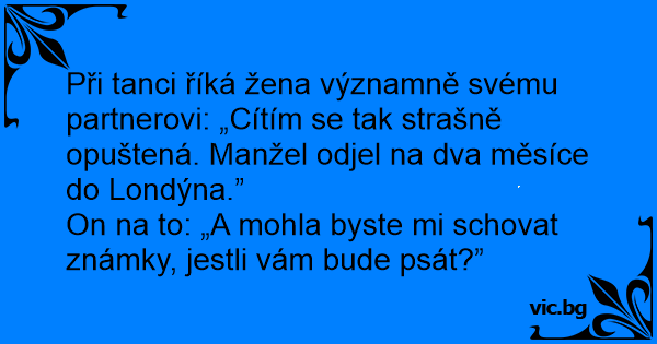 Při tanci říká žena významně svému partnerovi: „Cítím se tak strašně opuštená. Manžel odjel na dva měsíce do Londýna.”