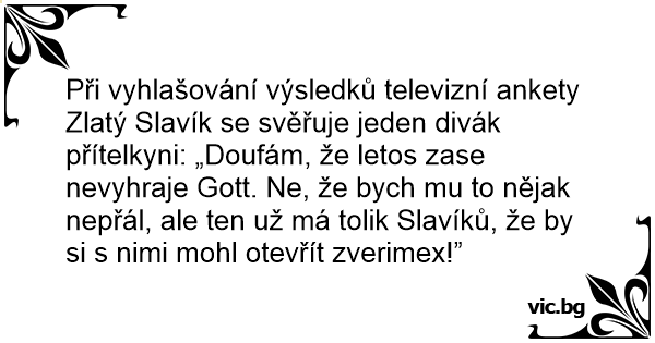 Při vyhlašování výsledků televizní ankety Zlatý Slavík se svěřuje jeden divák přítelkyni: „Doufám, že letos zase nevyhraje Gott. Ne, že bych mu to nějak nepřál, ale ten už má tolik Slavíků, že by si s nimi mohl otevřít zverimex!”
