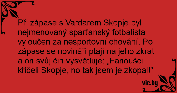 Při zápase s Vardarem Skopje byl nejmenovaný sparťanský fotbalista vyloučen za nesportovní chování. Po zápase se novináři ptají na jeho zkrat a on svůj čin vysvětluje: „Fanoušci křičeli Skopje, no tak jsem je zkopal!”