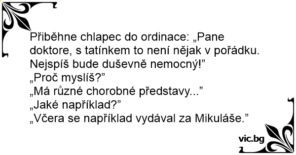 Přiběhne chlapec do ordinace: „Pane doktore, s tatínkem to není nějak v pořádku. Nejspíš bude duševně nemocný!”