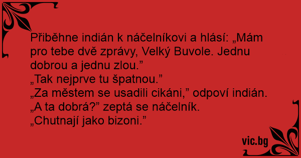Přiběhne indián k náčelníkovi a hlásí: „Mám pro tebe dvě zprávy, Velký Buvole. Jednu dobrou a jednu zlou.”