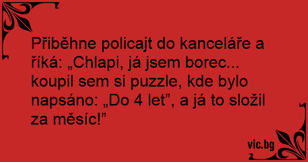 Přiběhne policajt do kanceláře a říká: „Chlapi, já jsem borec... koupil sem si puzzle, kde bylo napsáno: „Do 4 let”, a já to složil za měsíc!”