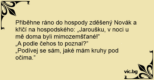 Přiběhne ráno do hospody zděšený Novák a křičí na hospodského: „Jaroušku, v noci u mě doma byli mimozemšťané!”