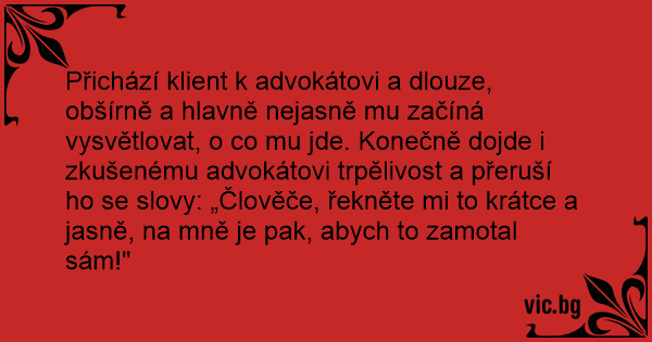 Přichází klient k advokátovi a dlouze, obšírně a hlavně nejasně mu začíná vysvětlovat, o co mu jde. Konečně dojde i zkušenému advokátovi trpělivost a přeruší hо se slovy: „Člověče, řekněte mi to krátce a jasně, na mně je pak, abych to zamotal sám!"
