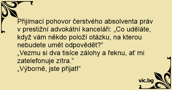 Přijímací pohovor čerstvého absolventa práv v prestižní advokátní kanceláři: „Co uděláte, když vám někdo položí otázku, na kterou nebudete umět odpovědět?”