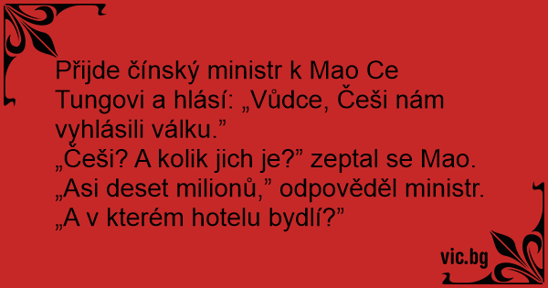 Přijde čínský ministr k Mao Ce Tungovi a hlásí: „Vůdce, Češi nám vyhlásili válku.”