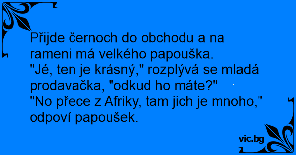 Černoch s papouškem na rameni vejde do obchodu a Prodavačka praví: "Je krásný, odkud ho máte ?" "Z Afriky, tam je jich plno," odpoví papoušek.