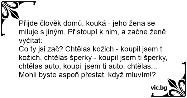 Přijde člověk domů, kouká - jeho žena se miluje s jiným. Přistoupí k nim, a začne ženě vyčítat: