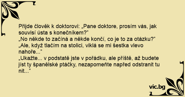 Přijde člověk k doktorovi: „Pane doktore, prosím vás, jak souvisí ústa s konečníkem?”