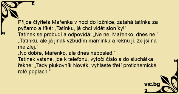 Přijde čtyřletá Mařenka v noci do ložnice, zatahá tatínka za pyžamo a říká: „Tatínku, já chci vidět sloníky!”