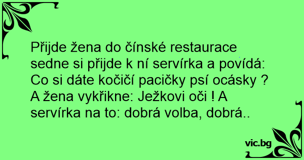 Přijde žena do čínské restaurace sedne si přijde k ní servírka a povídá: Co si dáte kočičí pacičky psí ocásky ? A žena vykřikne: Ježkovi oči ! A servírka na to: dobrá volba, dobrá..