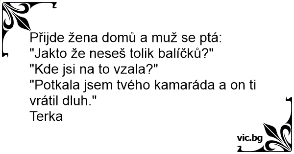 Přijde žena domů a muž se ptá: "Jakto že neseš tolik balíčků?" "Kde jsi na to vzala?" "Potkala jsem tvého kamaráda a on ti vrátil dluh." Terka
