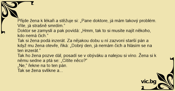 Tak si žena podá inzerát. Za nějakou dobu u ní zazvoní starší pán a když mu žena otevře, říká: „Dobrý den, já nemám čich a hlásím se na ten inzerát.”