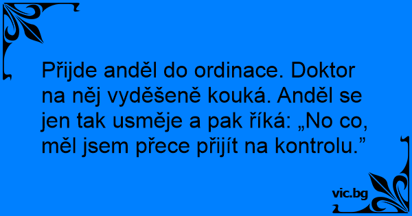 Přijde anděl do ordinace. Doktor na něj vyděšeně kouká. Anděl se jen tak usměje a pak říká: „No co, měl jsem přece přijít na kontrolu.”