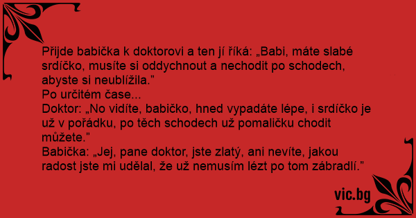 Přijde babička k doktorovi a ten jí říká: „Babi, máte slabé srdíčko, musíte si oddychnout a nechodit po schodech, abyste si neublížila.”