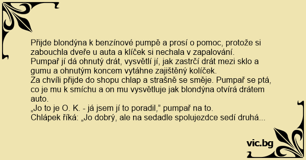 Za chvíli přijde do shopu chlap a strašně se směje. Pumpař se ptá, co je mu k smíchu a on mu vysvětluje jak blondýna otvírá drátem auto.