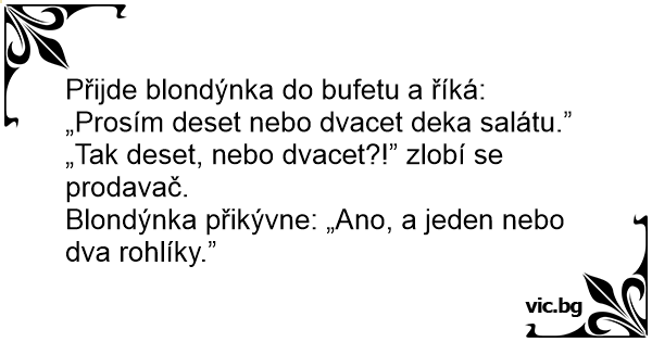 Přijde blondýnka do bufetu a říká: „Prosím deset nebo dvacet deka salátu.”