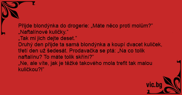 Druhý den přijde ta samá blondýnka a koupí dvacet kuliček, třetí den už šedesát. Prodavačka se ptá: „Na co tolik naftalínu? To máte tolik skříní?”