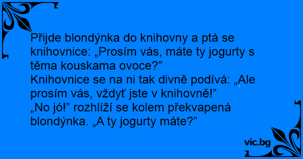 Přijde blondýnka do knihovny a ptá se knihovnice: „Prosím vás, máte ty jogurty s těma kouskama ovoce?”