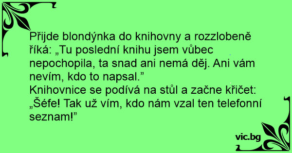 Knihovnice se podívá na stůl a začne křičet: „Šéfe! Tak už vím, kdo nám vzal ten telefonní seznam!”