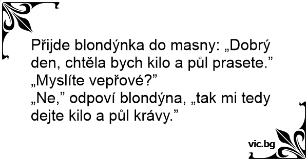 „Ne,” odpoví blondýna, „tak mi tedy dejte kilo a půl krávy.”