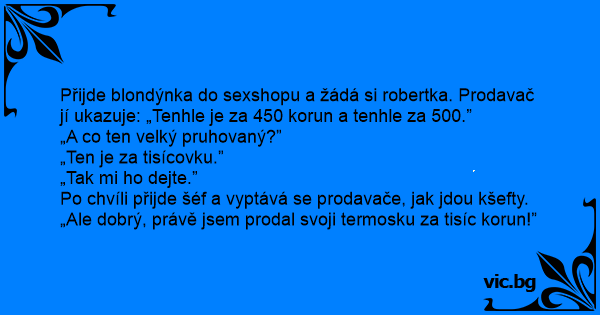 Přijde blondýnka do sexshopu a žádá si robertka. Prodavač jí ukazuje: „Tenhle je za 450 korun a tenhle za 500.”