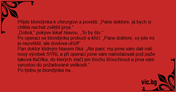 Pan doktor klidným hlasem říká: „Ale paní, my jsme vám dali náš nový výrobek SYRL a při operaci jsme vám nainstalovali pod paže taková tlačítka, do kterých stačí jen trochu šťouchnout a prsa vám vyrostou do požadované velikosti.”