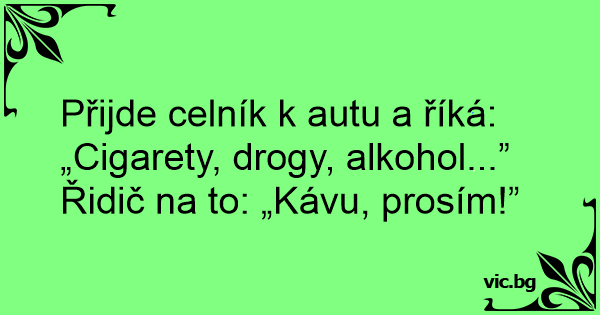 Přijde celník k autu a říká: „Cigarety, drogy, alkohol...”