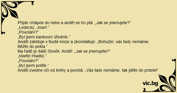 Anděl zalistuje v tlusté knize a zkonstatuje: „Bohužel, vás tady nemáme. Běžte do pekla.”
