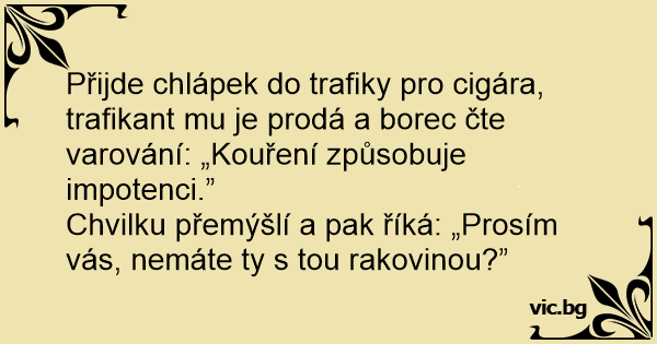 Přijde chlápek do trafiky pro cigára, trafikant mu je prodá a borec čte varování: „Kouření způsobuje impotenci.”