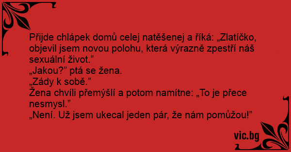 Přijde chlápek domů celej natěšenej a říká: „Zlatíčko, objevil jsem novou polohu, která výrazně zpestří náš sexuální život.”