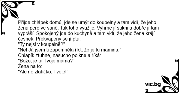 Přijde chlápek domů, jde se umýt do koupelny a tam vidí, že jeho žena pere ve vaně. Tak toho využije. Vyhrne jí sukni a dobře jí tam vypráší. Spokojený jde do kuchyně a tam vidí, že jeho žena krájí česnek. Překvapený se jí ptá: