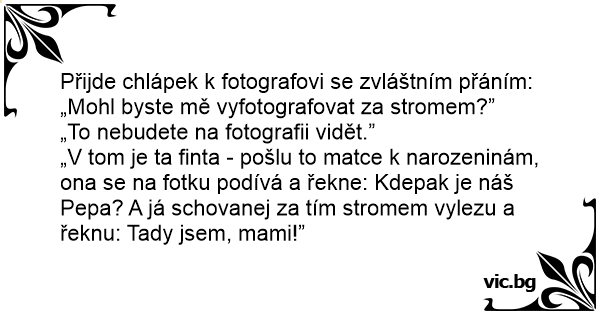 „V tom je ta finta - pošlu to matce k narozeninám, ona se na fotku podívá a řekne: Kdepak je náš Pepa? A já schovanej za tím stromem vylezu a řeknu: Tady jsem, mami!”
