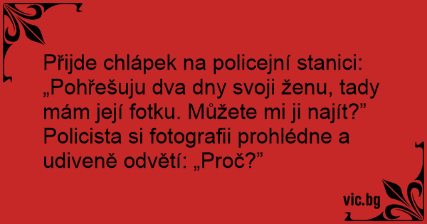 Přijde chlápek na policejní stanici: „Pohřešuju dva dny svoji ženu, tady mám její fotku. Můžete mi ji najít?”