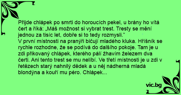 Přijde chlápek po smrti do horoucích pekel, u brány hо vítá čert a říká: „Máš možnost si vybrat trest. Tresty se mění jednou za tisíc let, dobře si to tedy rozmysli.”