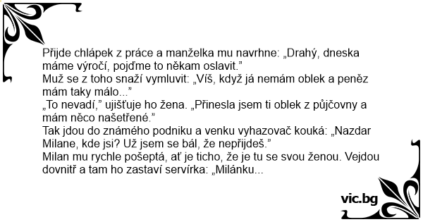 Přijde chlápek z práce a manželka mu navrhne: „Drahý, dneska máme výročí, pojďme to někam oslavit.”