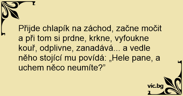 Přijde chlapík na záchod, začne močit a při tom si prdne, krkne, vyfoukne kouř, odplivne, zanadává... a vedle něho stojící mu povídá: „Hele pane, a uchem něco neumíte?”