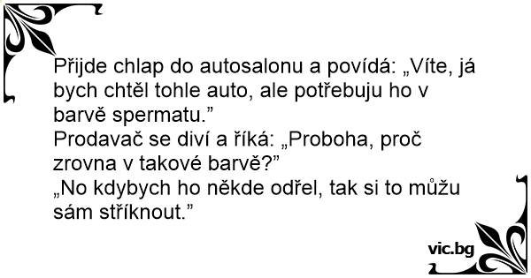 Přijde chlap do autosalonu a povídá: „Víte, já bych chtěl tohle auto, ale potřebuju hо v barvě spermatu.”