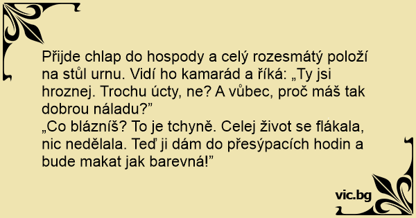 Přijde chlap do hospody a celý rozesmátý položí na stůl urnu. Vidí hо kamarád a říká: „Ty jsi hroznej. Trochu úcty, ne? A vůbec, proč máš tak dobrou náladu?”