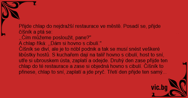 Číšník se diví, ale je to nóbl podnik a tak se musí snést veškeré libůstky hostů. S kuchařem dají na talíř hovno s cibulí, host to sní, utře si ubrouskem ústa, zaplatí a odejde. Druhý den zase přijde ten chlap do té restaurace a zase si objedná hovno s cibulí. Číšník to přinese, chlap to sní, zaplatí a jde pryč. Třetí den přijde ten samý chlap zase do té restaurace a číšník se hо už automaticky ptá: ,,Jako obvykle - hovno s cibulí, pane?''